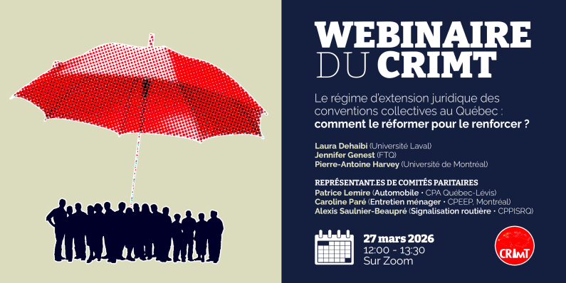 Alors que des annonces laissent entrevoir une possible réforme de ce régime, ce webinaire du CRIMT, réunissant des chercheuses et chercheurs du CRIMT ainsi que des personnes issues des milieux de pratique, propose d’examiner le rôle qu’il joue dans la régulation du travail, les défis auxquels il est aujourd’hui confronté et les pistes de réflexion pour l’avenir.